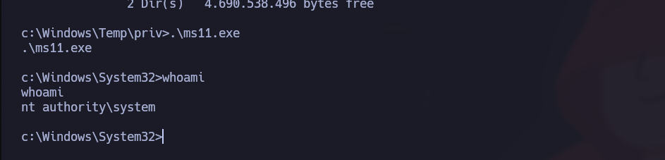 Une fois le fichier transféré, nous exécutons **ms11-046.exe** sur la machine cible pour exploiter la vulnérabilité et obtenir un shell avec les privilèges SYSTEM. Pour cela, nous utilisons la commande suivante :
