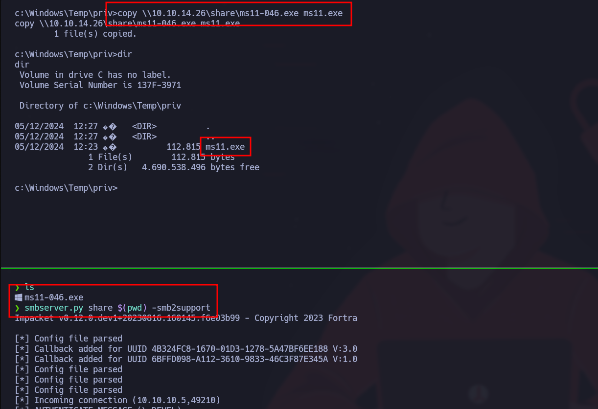 > Nous utilisons **smbserver.py** pour partager un répertoire contenant le fichier exploit **ms11-046.exe**. Ce fichier est ensuite copié sur la machine cible.