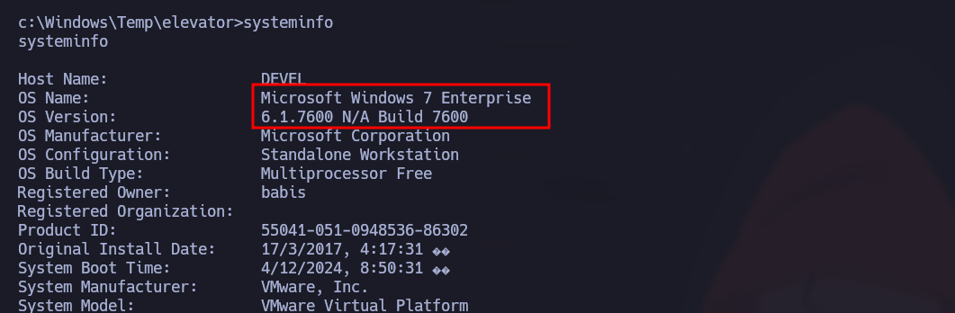 Avec la commande **`systeminfo`**, nous identifions que la machine utilise **Windows 7 Enterprise**, ce qui ouvre la possibilité d'exploiter des vulnérabilités connues pour cette version.