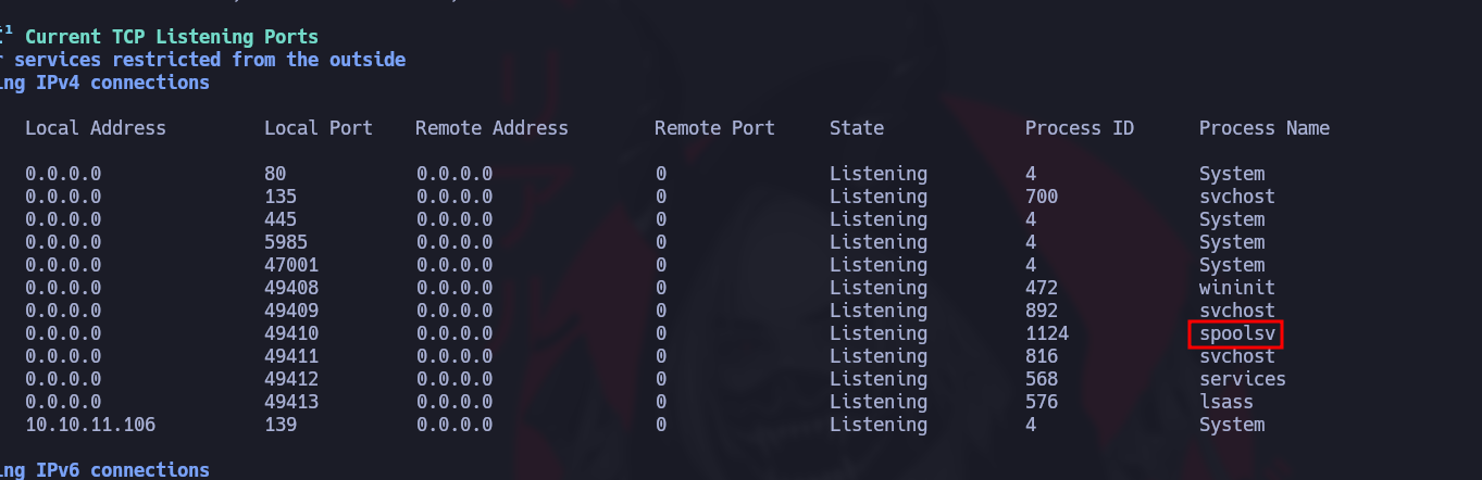 Un processus **spoolsv** vulnérable est détecté, écoutant sur un port TCP.